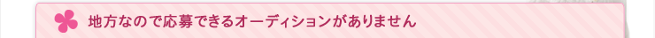 あまり応募できるオーディションが無い中 応募基準に当てはまるものには応募してきましたが・・・なかなかお声はかかりません。そんな簡単にかかるものとは思っていませんでしたが、やはり東京近辺の方が優先されてしまうのかな〜と思うようになってしまいました。
